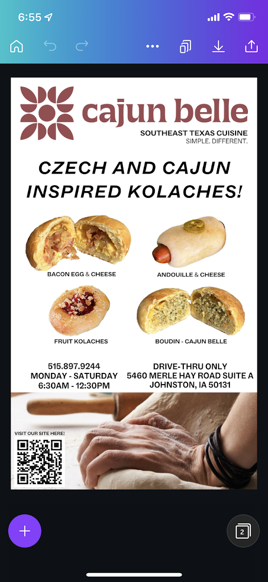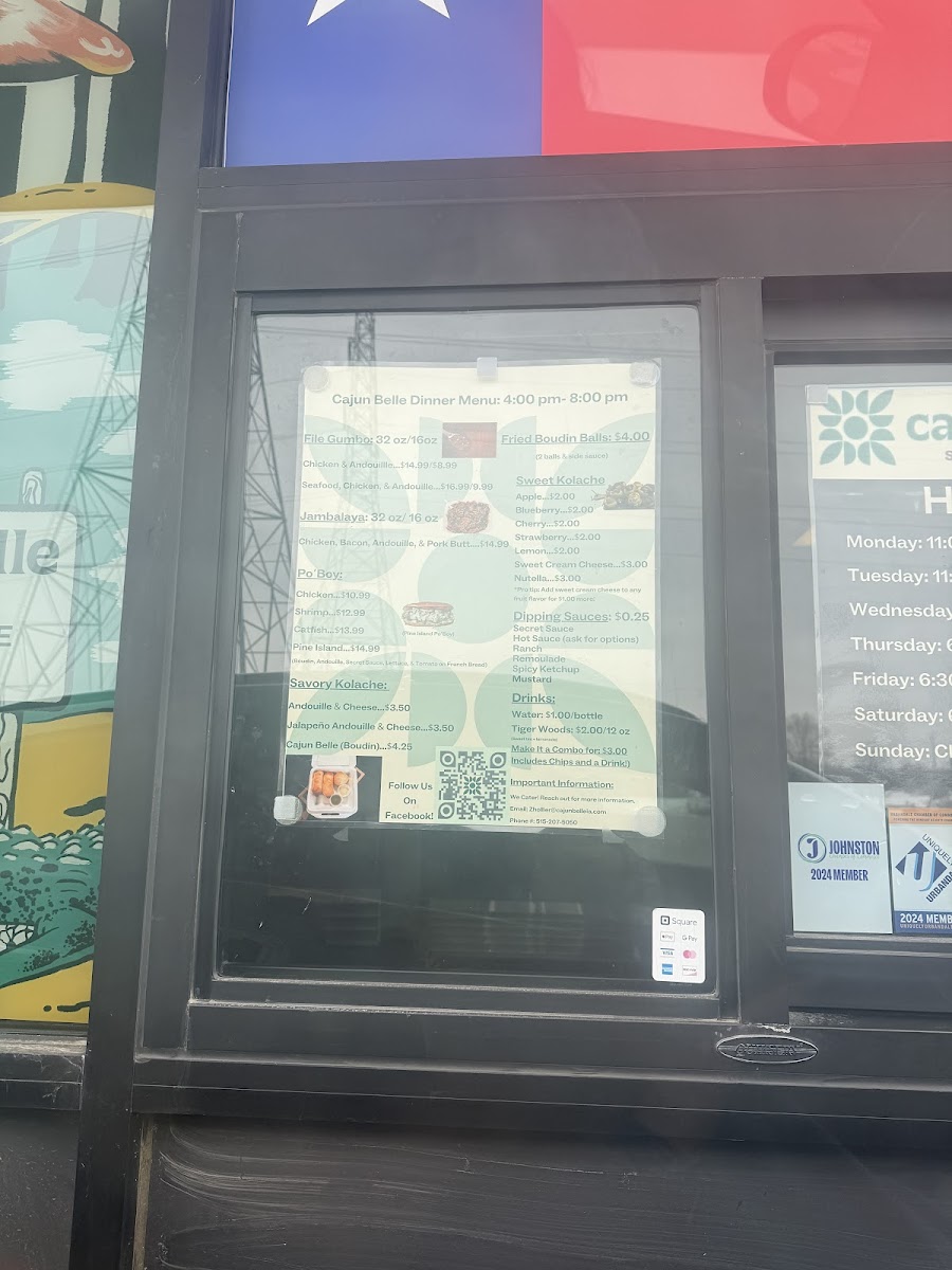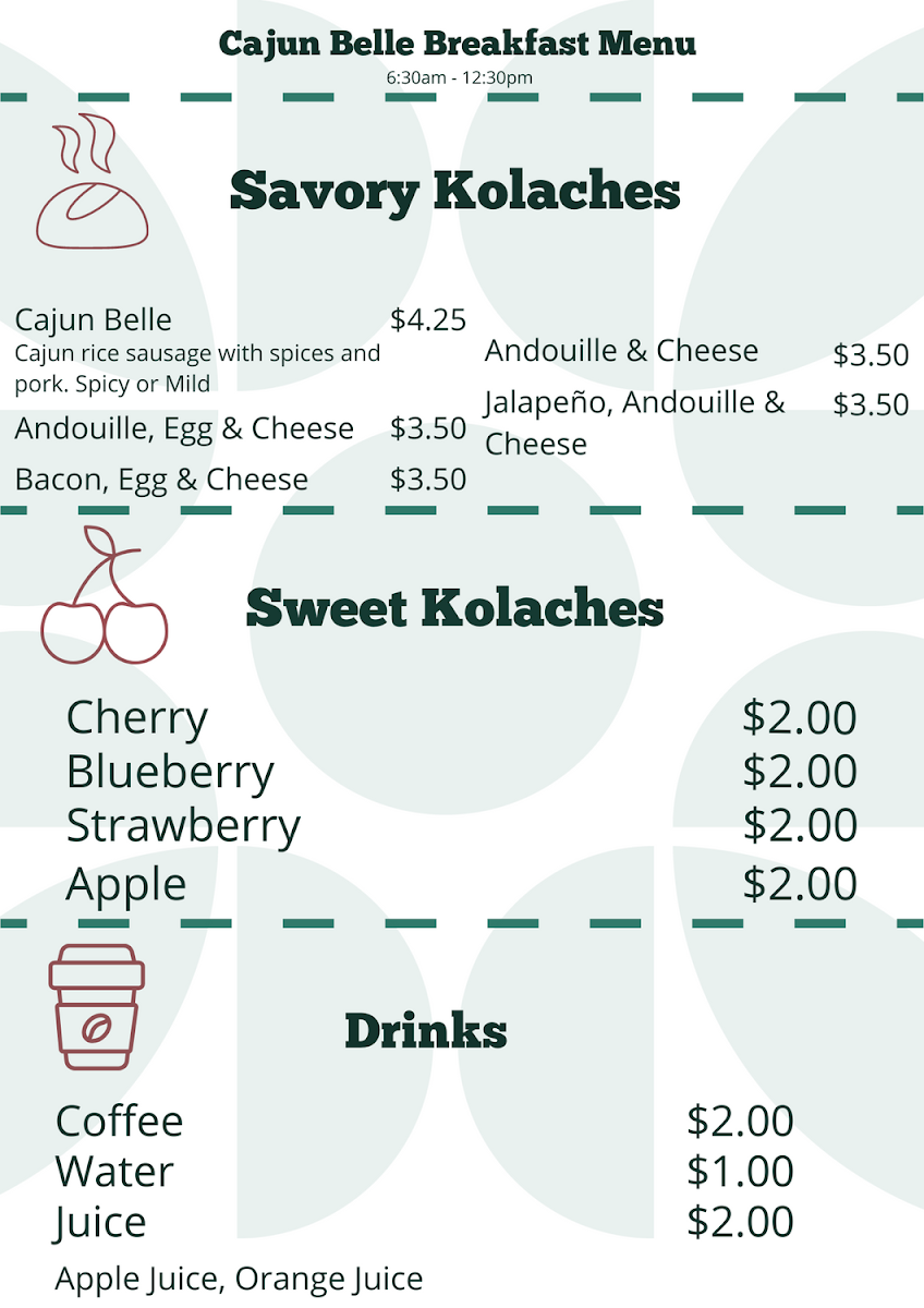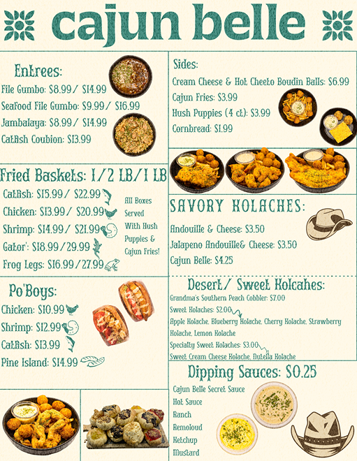 From a reviewer’s perspective, the menu at Cajun Belle offers a compact yet flavorful snapshot of Southern and Cajun comfort food, with highlights across several categories. The sides like Cornbread, Fried Boudin Balls, and Cream Cheese & Hot Cheeto Boudin Balls set a rich, indulgent tone, while the Cajun entrées-Filé Gumbo, Catfish Couvillion, and Jambalaya-deliver classic, hearty staples that define the restaurant’s identity. The Po’Boy selection, including Chicken Po' Boy, Catfish Po' Boy, Pine Island Po’ Boy, and Shrimp Po' Boy, adds variety for sandwich lovers, and the Kolache offerings such as Blueberry Kolache, Egg & Cheese Kolache, and Andouille & Cheese Kolache bring a unique twist. Fried basket options like Fried Frog Leg Basket, Fried Catfish Basket, and Fried Shrimp Basket emphasize bold, crispy textures, while Grandma's Southern Peach Cobbler rounds things out with a comforting dessert. Although specific prices aren’t listed, the menu’s diversity and focus on recognizable Cajun dishes make it appealing for those seeking both traditional flavors and casual, satisfying bites.